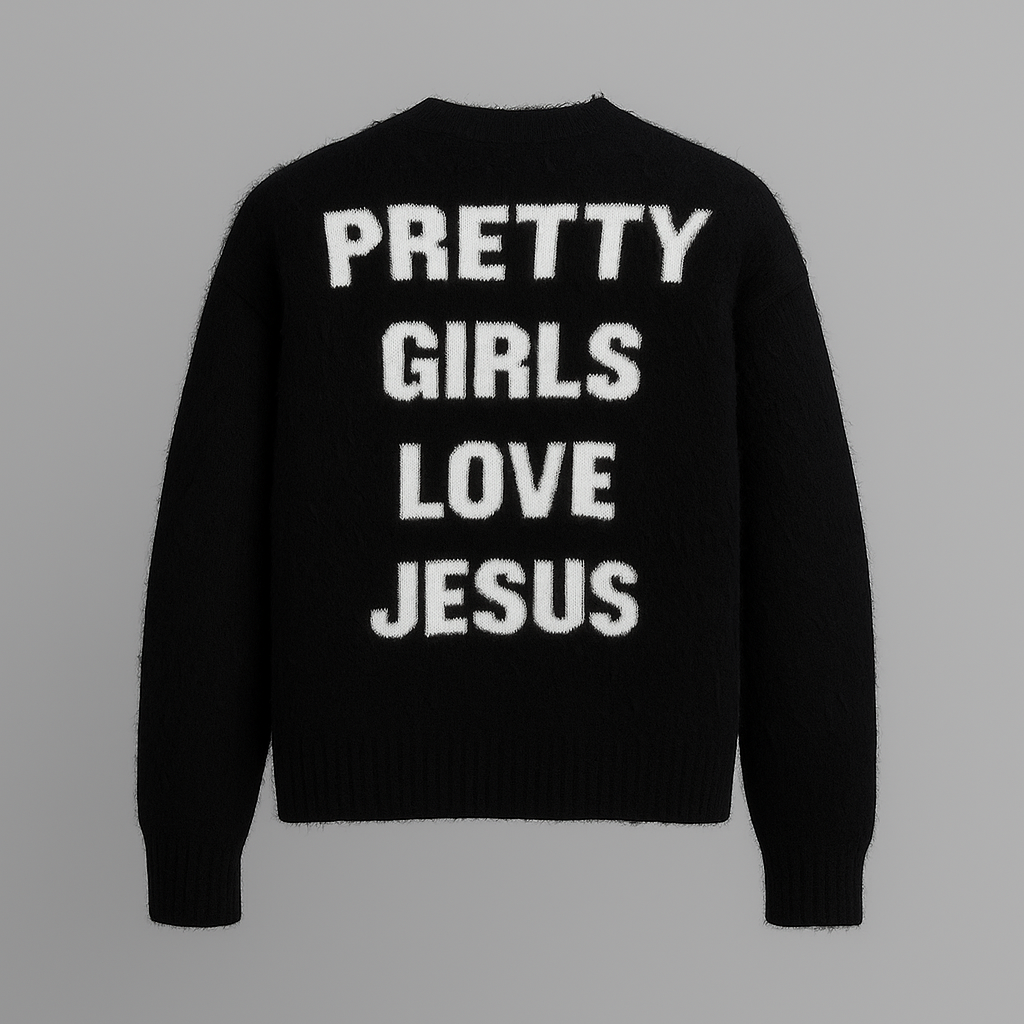 The Witness Sweater is more than a fit — it’s a message. With “Trust In Him” subtly embroidered on the front and “PRETTY GIRLS LOVE JESUS” boldly declared across the back, this piece turns your faith into fashion. Finished with Proverbs 3:5–6 stitched inside the collar, it’s designed to comfort, convict, and catch eyes — all at once.